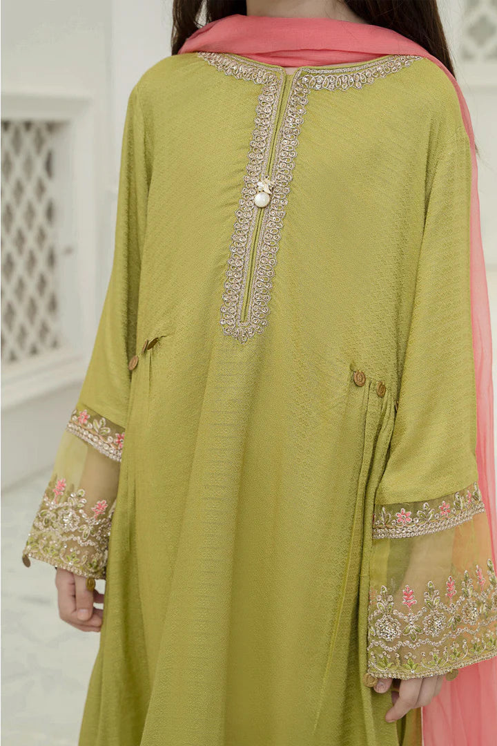 Maria B Kids Embroidered frock with shalwar and chiffon dupatta.